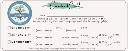 We thank you for your desire to partner with Memorial Park Church in the Rooted and Rising capital campaign. This will be a three year campaign, where the goal will be to complete the work this year, and collect all financial contributions by the end of 2027.