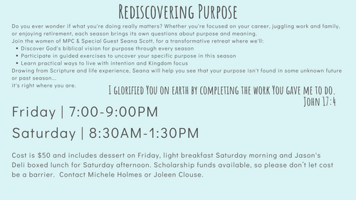 Women to Women is a weekly opportunity to gather in community, study God's word, share time in prayer and discussion, and deepen your relationship with other MPC women as well as the Lord.